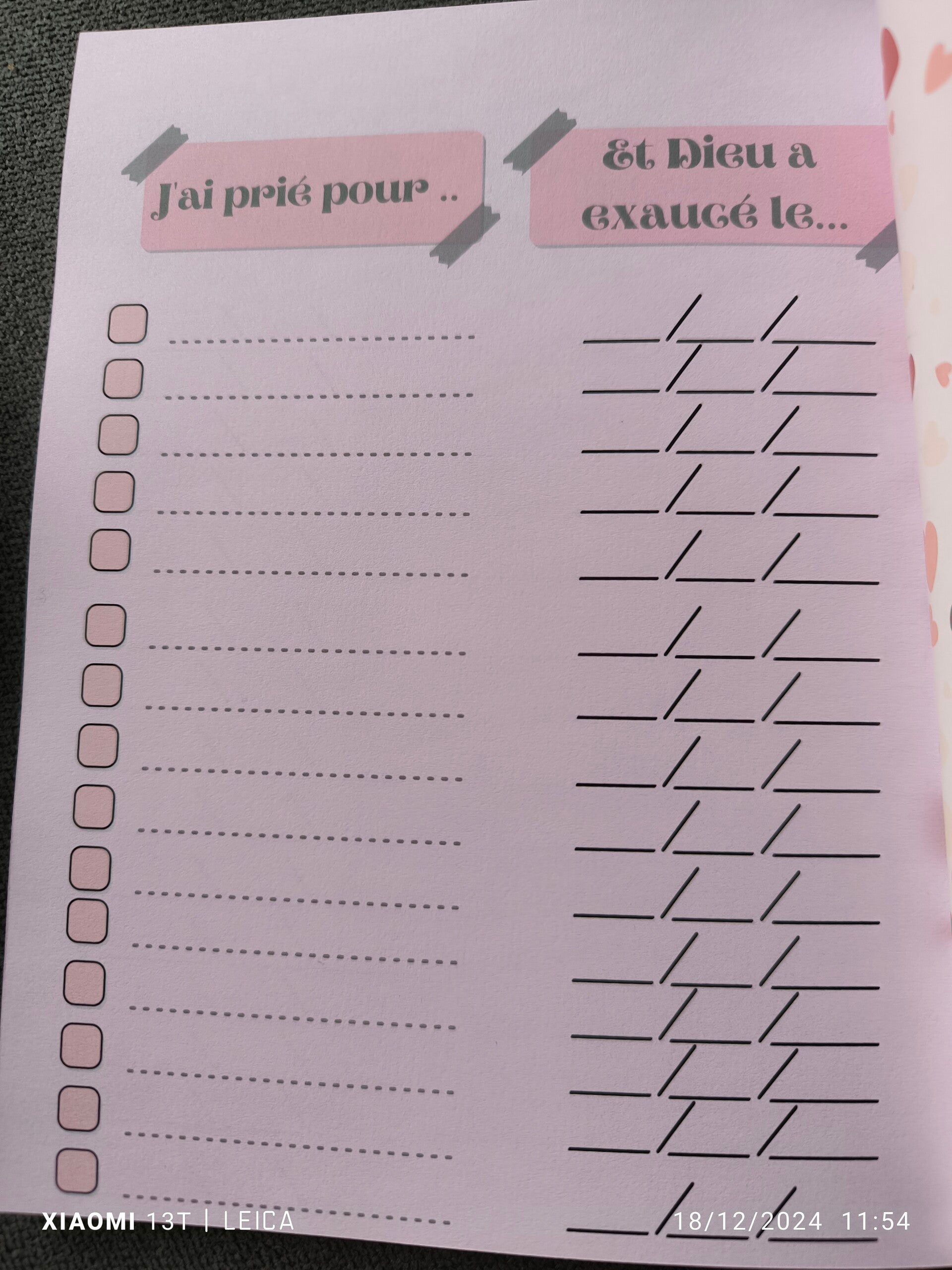 ✨ À la fin du carnet, tu trouveras des pages sur lesquelles tu peux marquer tes sujets de prière divers, et à côté de ce sujet de prière, la date à laquelle Dieu a exaucé ta requête. Ça permet de toujours te rappeler de la fidélité de Dieu dans ta vie.